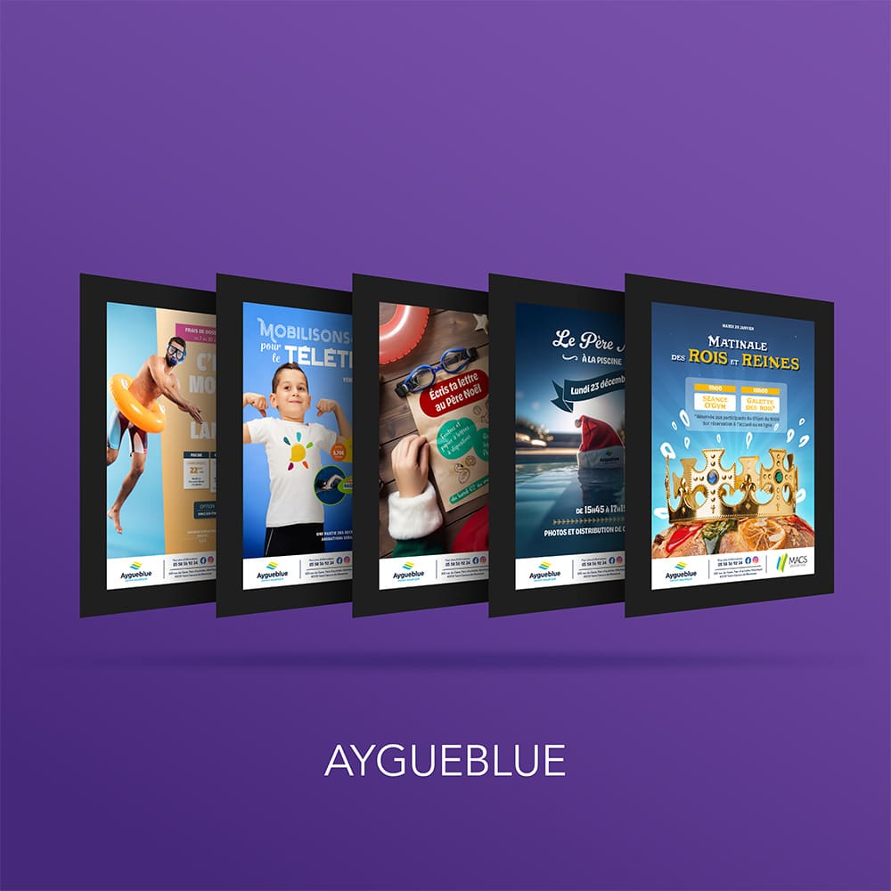 Imaginer les visuels de communication pour les événements du centre aquatique Aygueblue déclinés sur différents formats (A3, réseaux sociaux, TV…).