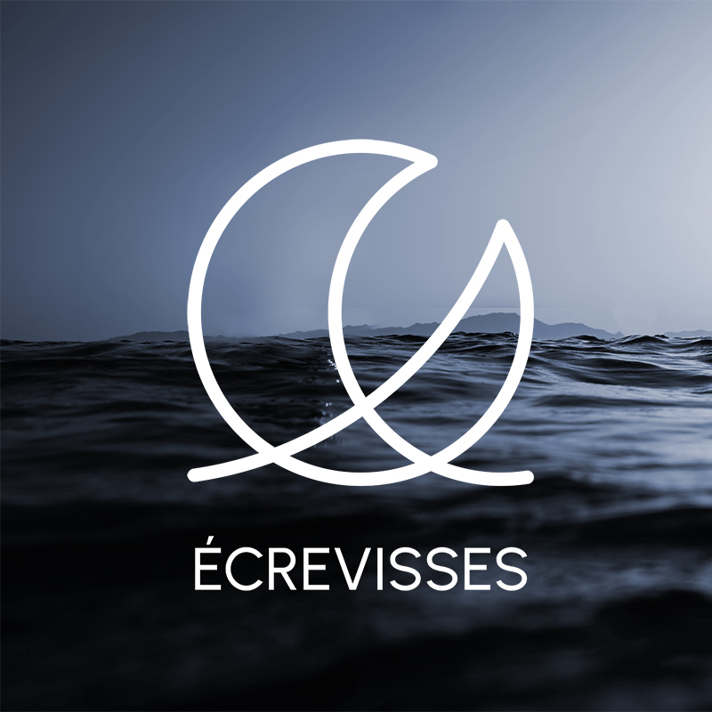 Pour la création du logo, les 2 contraintes étaient l’utilisation du noir et du blanc uniquement et le style devait être minimaliste. J’ai choisi de représenter la pince d’une écrevisse de manière très graphique et moderne. Je me suis appuyé sur l’utilisation de cercles qui représentent le cycle vertueux de la marque (technique d’upcycling). Le trait est continu et matérialise le cheminement des matières en débutant par la gauche, puis en étant recyclées par Écrevisses, et ressortant finalement sur la droite. Les formes évoquent aussi des vagues faisant directement référence à l’activité d’Écrevisses, à savoir la production de maillots de bain.