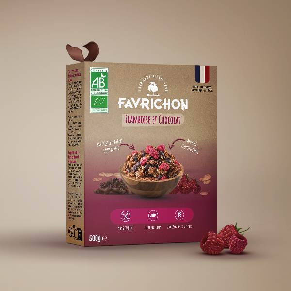 Proposer une refonte de packaging pour les céréales Favrichon « chocolat & framboise » avec pour contrainte de passer d’un sachet refermable à une boite cartonnée.