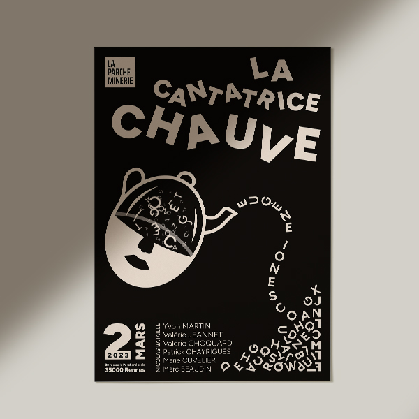 Pour le théâtre de la Parcheminerie à Rennes, concevoir une affiche (au format A3) pour la pièce d’Eugène Ionesco «La Cantatrice chauve», en mettant en scène le rapport texte / image.