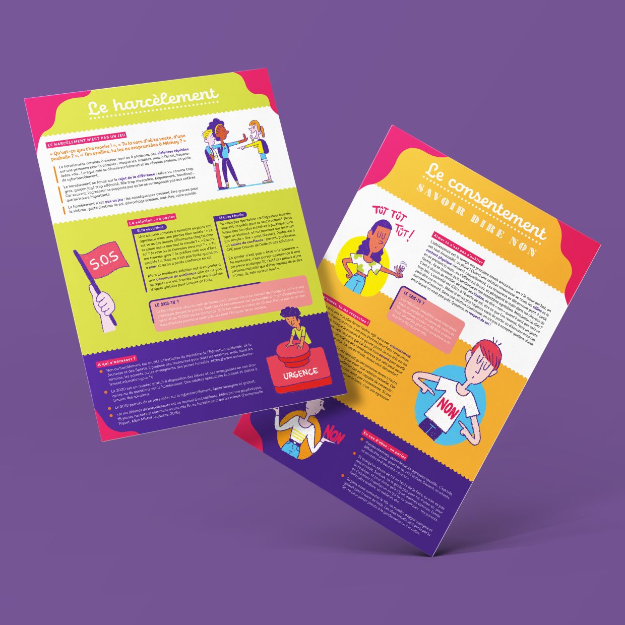 D’après des illustrations d’Océane Meklemberg et des textes de Sophie Bordet-Petillon, mettre en page 2 posters informatifs sur le harcèlement et le consentement à destination des centres de soins, des salles d’attente et des cabinets médicaux.
