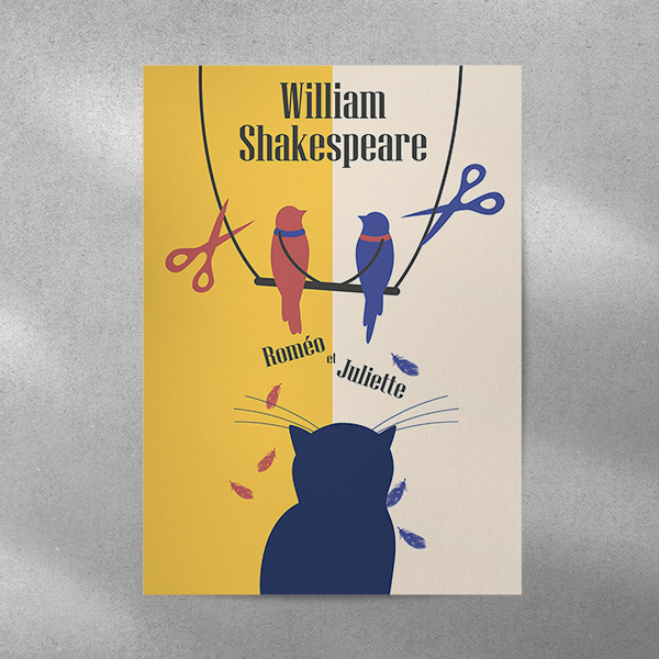 Roméo et Juliette sont représentés sous la forme d’oiseaux, mais leur liberté est entravée (ils sont attachés au perchoir, prisonniers de leur destin). Les ciseaux représentent les 2 familles qui vont mener les protagonistes à un destin tragique et inéluctable (évoqué par la présence du chat).