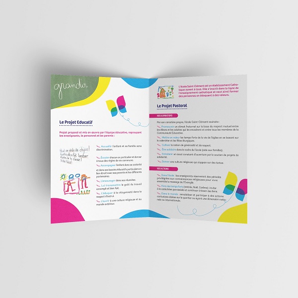 Proposer un nouveau logo pour l’école Saint-Clément et réaliser un document de présentation de l’école au format A4 ouvert, A5 plié recto/verso. Les choix graphiques seront justifiés par un argumentaire clair et précis.